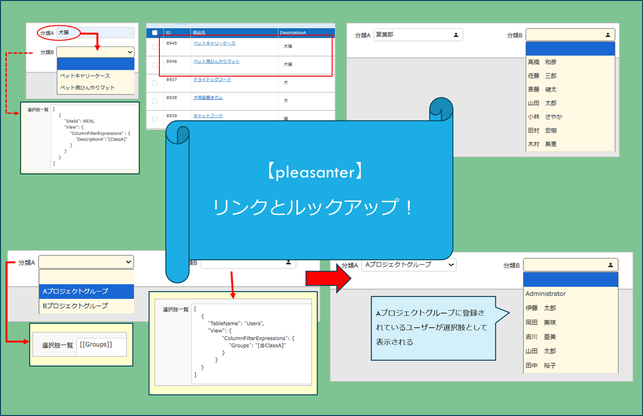 分類Aで指定したグループのユーザーを分類Bの選択肢に表示する例です。
