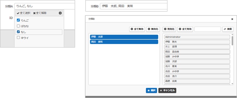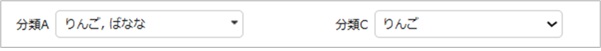 | 分類A | メニュー | 選択肢:[[9205]] 自動ポストバック:ON | ①の例では複数選択OFF ②の例では複数選択ON |