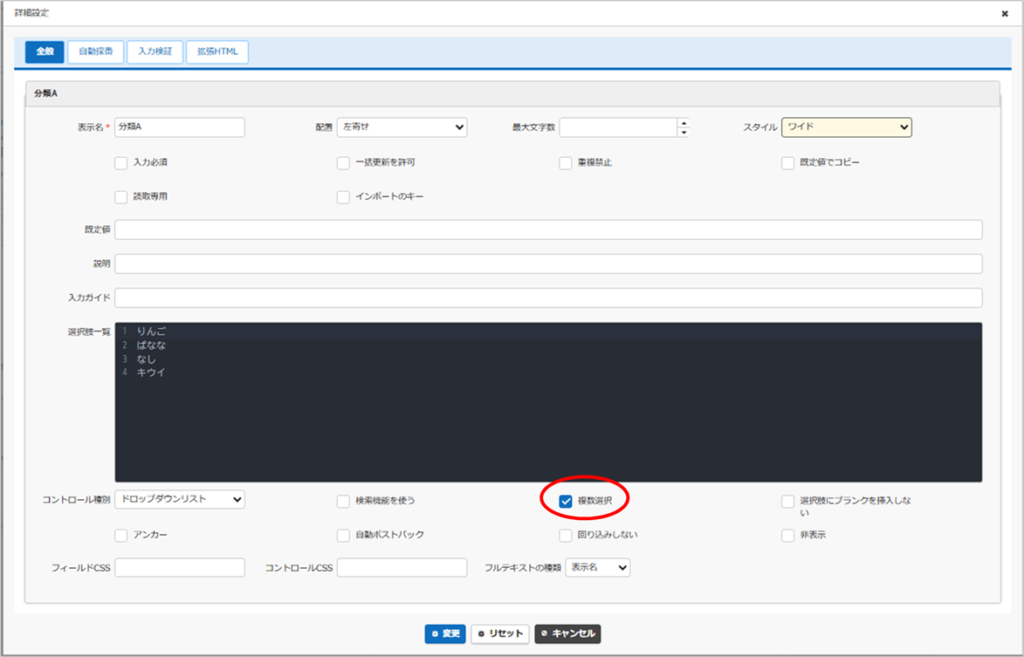 テーブルの管理:エディタ:項目の詳細設定:複数選択