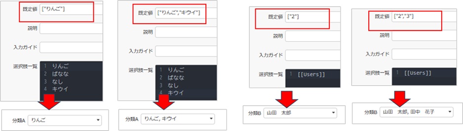 複数選択の場合、[“りんご”] のように、配列の書き方で設定すると規定値が設定できます。