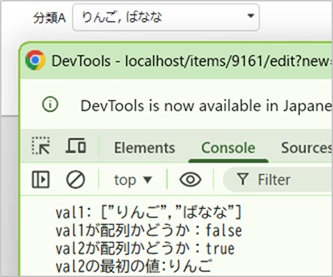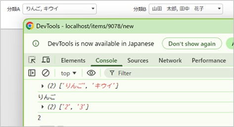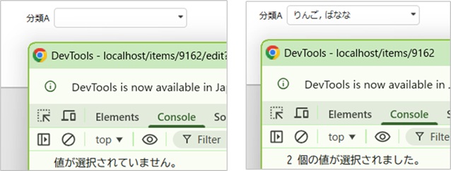 以下コード例では、分類Aの選択肢に変化がある都度実行され、選択されていない場合「値が選択されていません」とコンソールに出力、選択されている場合は選択されている値の個数をコンソールに出力します。
