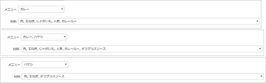 | 分類B | 材料 | 選択肢:玉ねぎ,人参,じゃがいも,肉,カレールー,デミグラスソース,キャベツ,小麦粉 複数選択:ON |