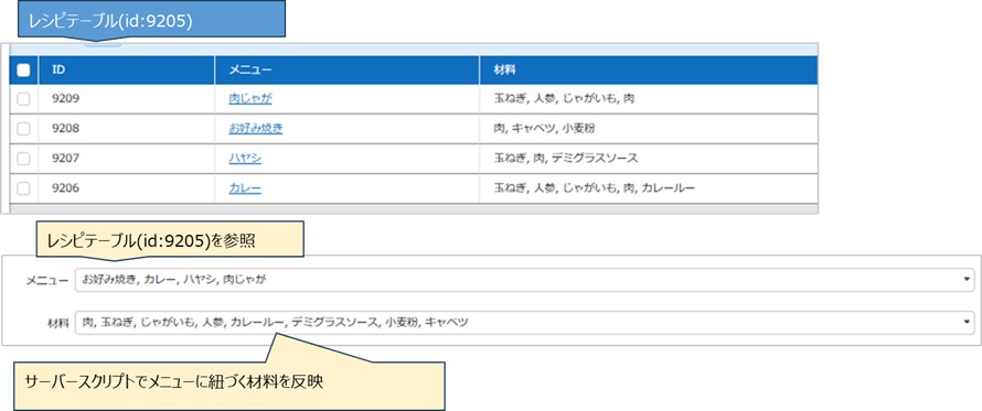 (3)の変型判。メニューを選ぶとほかの項目に材料が出力される、メニューと材料は別のマスタテーブルに持っていて、そのテーブルを参照する。というルックアップのような機能を複数選択でやってみます。