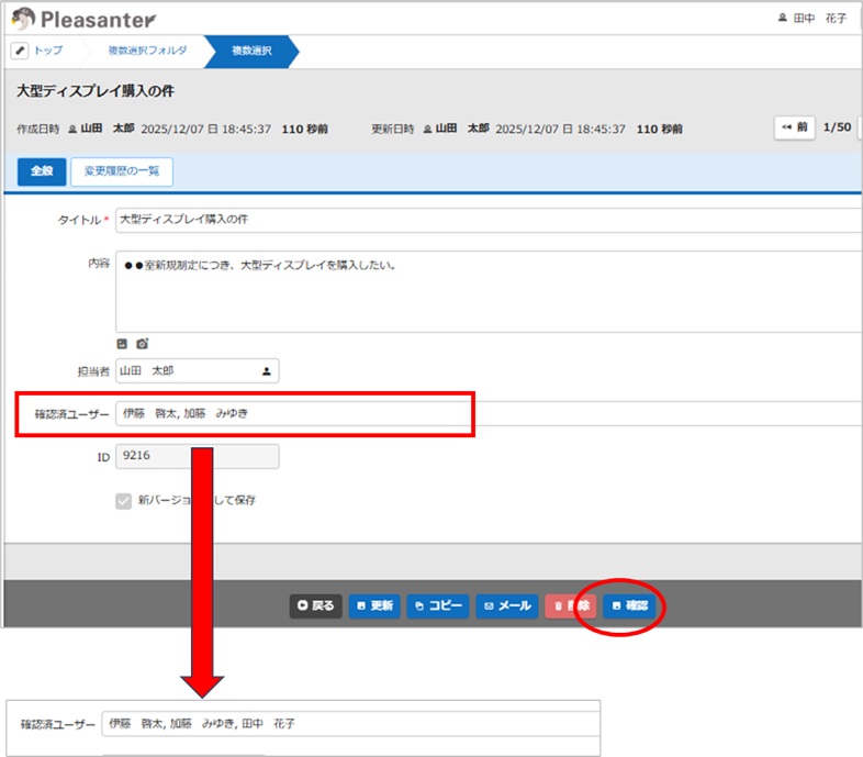 プロセスで「確認」ボタンを押したら、そのユーザーを分類項目(複数選択)に追加する、というのをやってみます。