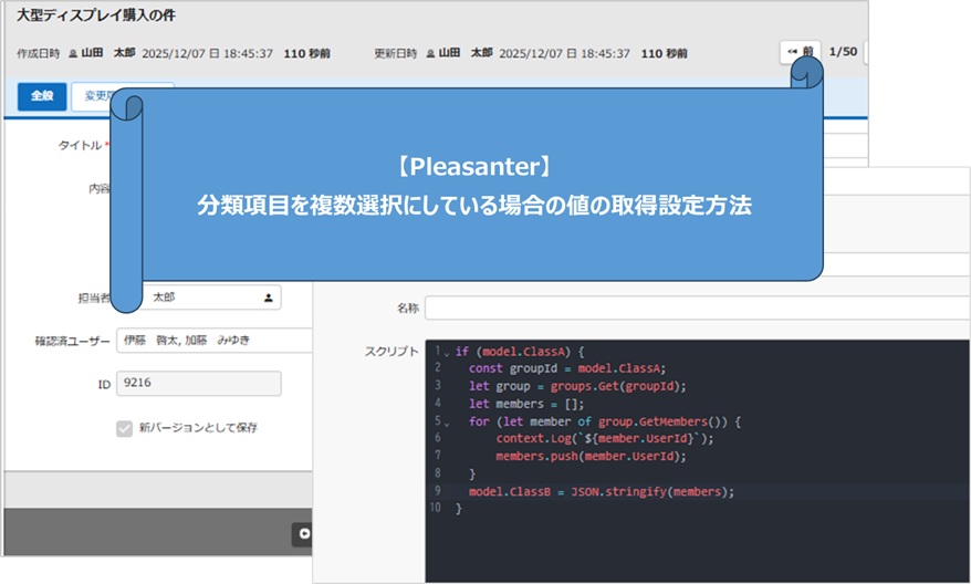 複数選択の分類項目から値を取得すしたいとき、スクリプトでは単一選択の時と同じ書き方で値の取得ができました。