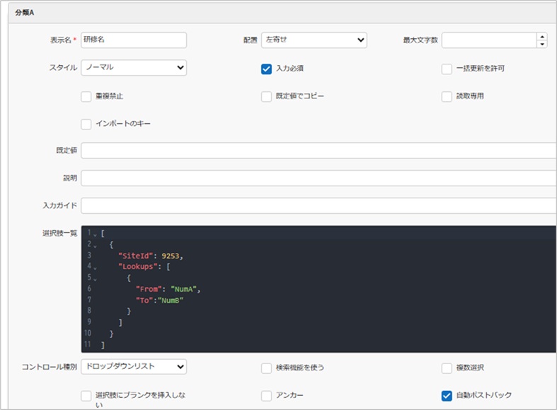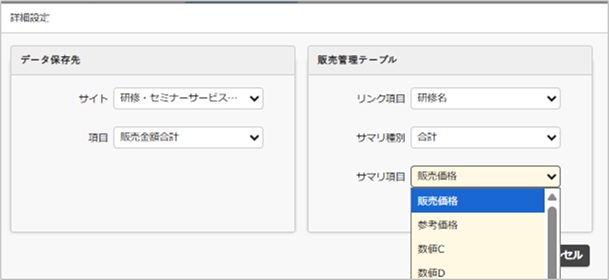 販売管理の分類Aを「研修・セミナー一覧」サイトにリンクさせています。本筋とは関係ありませんが、Lookupで「参考価格」も持ってきています。自動ポストバックはお好みで。