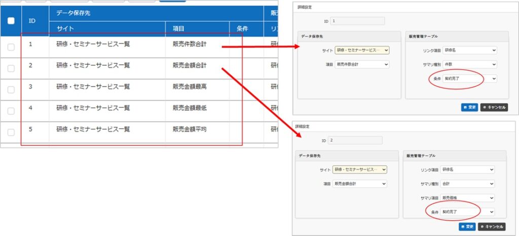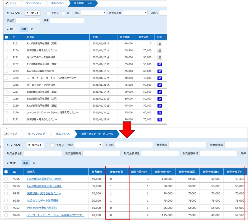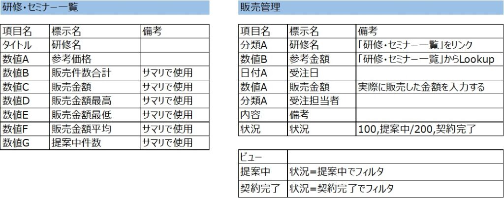 ■ 販売管理:契約した「研修名」「契約日」「販売金額」を入力していく。「研修・セミナー一覧」テーブルをリンクしている。