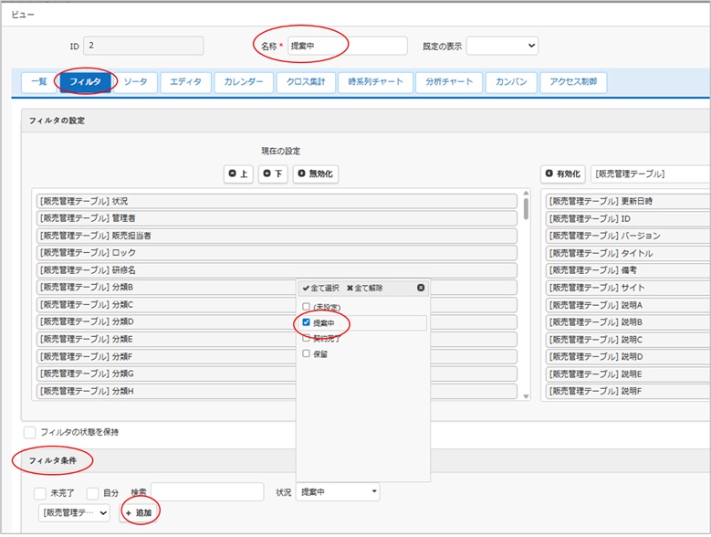 ビューの「フィルタ」のタブで [状況]が「提案中」の条件を設定します。名称は「提案中」としました。