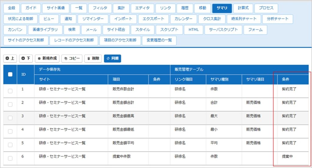 なお、[条件]の設定欄はビューを設定していないときは表示されません。なので、設定の順番はビューを設定してからサマリを設定する、という流れになります。