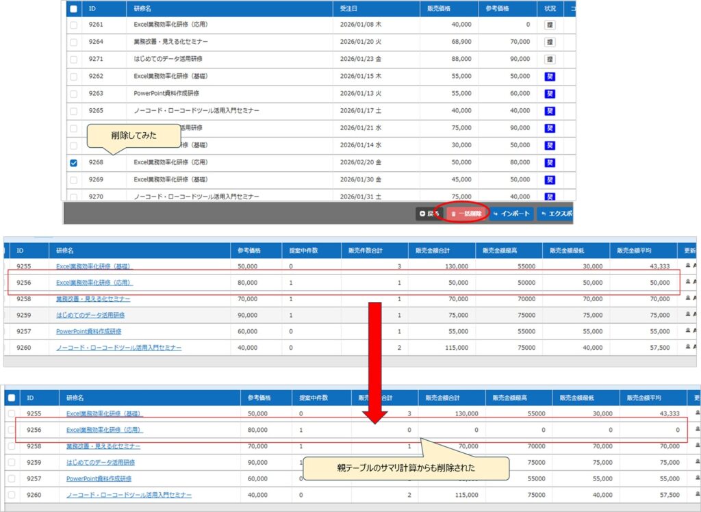 親テーブルのサマリ計算からも削除レコードの件数、金額が差し引かれました。