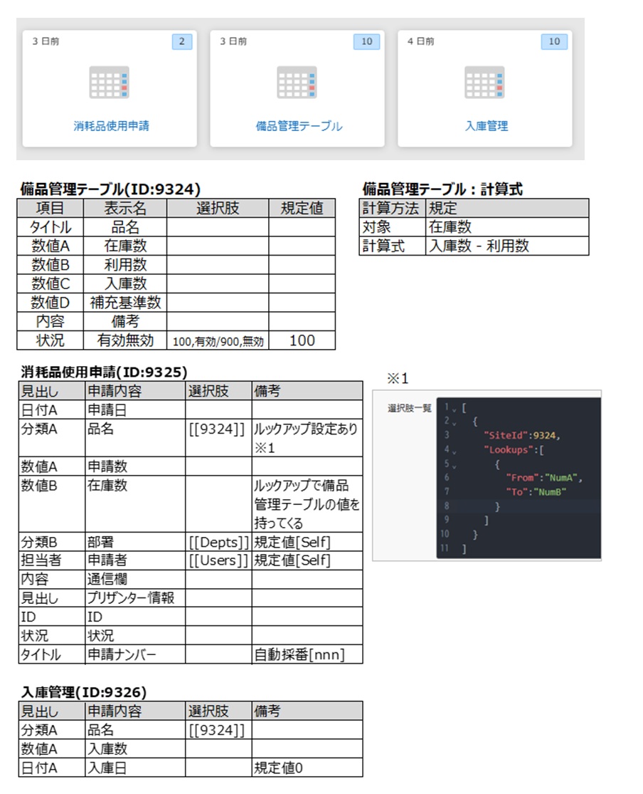 「消耗品使用申請」「備品管理テーブル」「入庫管理」の3つのテーブルを用意します。