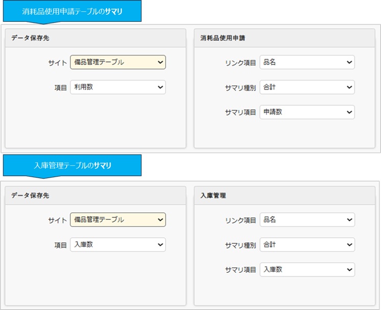 申請・使用データを子テーブルに集約し、サマリ機能で数量を集計することで、在庫を自動管理!