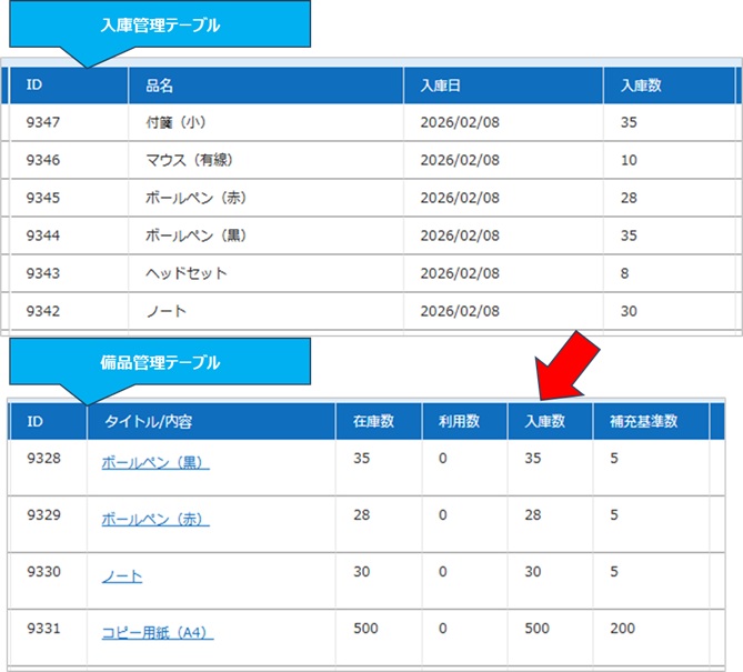 備品管理テーブルの「入庫数」が増えると同時に「在庫数」も増えています。