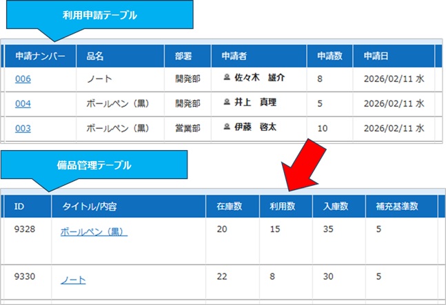 消耗品使用申請テーブルでの各品目の申請数の合計(累計)値が、親テーブル「備品管理テーブル」の各品目の「利用数」に表示される、ということになります。