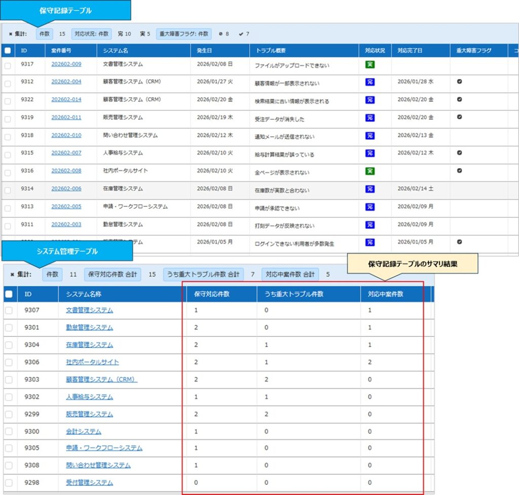 子テーブルで保守の記録を管理。親テーブルには各システムの保守対応件数、重大トラブル件数などを自動集計する。