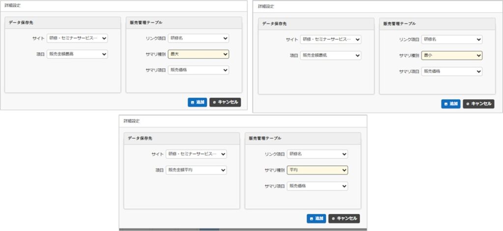 同様に、「販売金額最高」ではサマリ種別「最大」を、「販売金額最低」ではサマリ種別「最小」を、「販売金額平均」ではサマリ種別「平均」を選択してサマリを追加していきます。