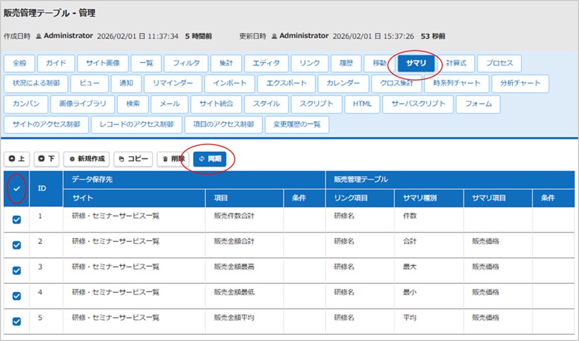 ・サマリ設定前に子レコードが存在する場合は「同期」を使って、既存データを再集計する必要がある。