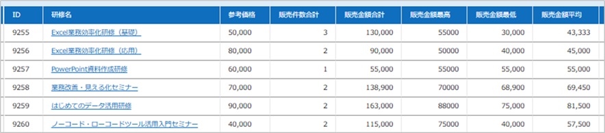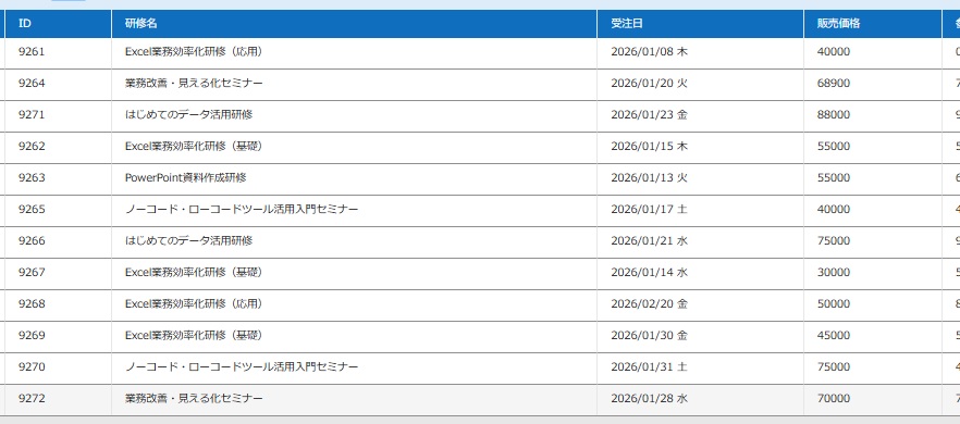 ■ 研修・セミナー一覧:研修、セミナー名、参考価格のマスタ。ここに販売記録テーブルの状況を反映していく。